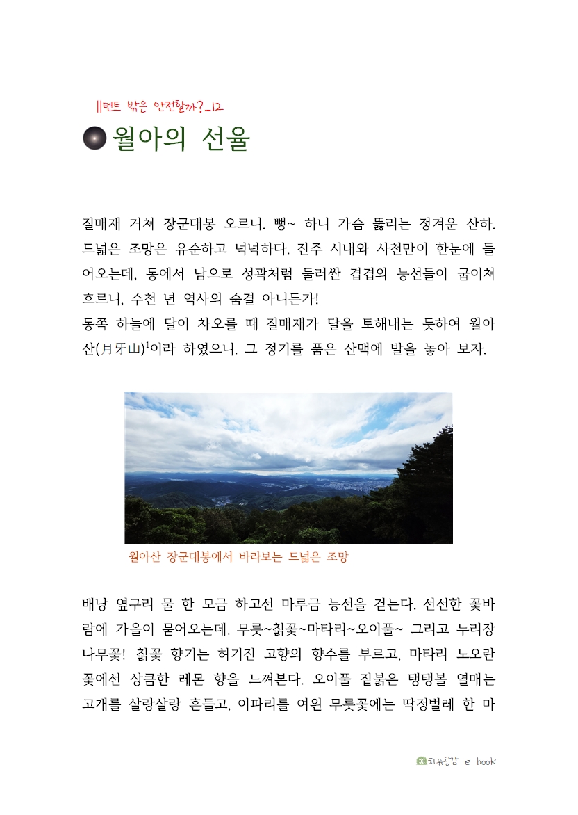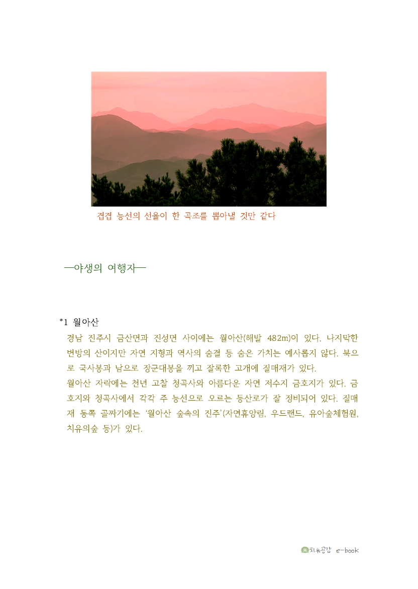 동쪽 하늘에 달이 차오를 때 질매재가 달을 토해내는 듯하여 월아산(月牙山)1이라 하였으니. 그 정기를 품은 산맥에 발을 놓아 보자.