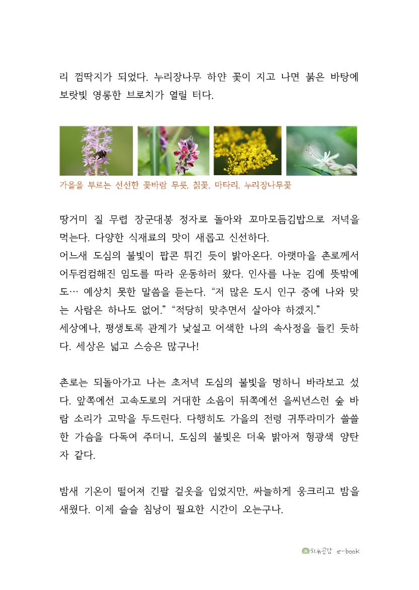 촌로는 되돌아가고 나는 초저녁 도심의 불빛을 멍하니 바라보고 섰다. 앞쪽에선 고속도로의 거대한 소음이 뒤쪽에선 을씨년스런 숲 바람 소리가 고막을 두드린다. 다행히도 가을의 전령 귀뚜라미가 쓸쓸한 가슴을 다독여 주더니, 도심의 불빛은 더욱 밝아져 형광색 양탄자 같다.