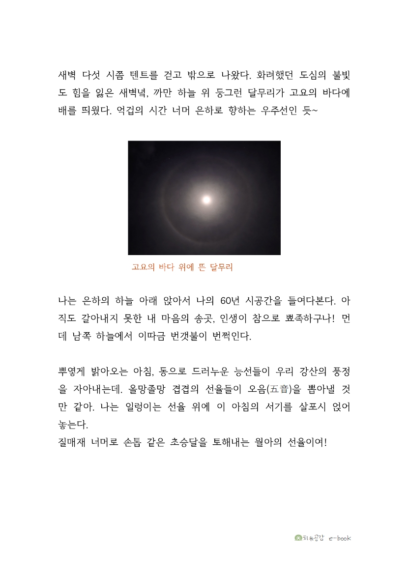 새벽 다섯 시쯤 텐트를 걷고 밖으로 나왔다. 화려했던 도심의 불빛도 힘을 잃은 새벽녘, 까만 하늘 위 둥그런 달무리가 고요의 바다에 배를 띄웠다. 억겁의 시간 너머 은하로 향하는 우주선인 듯~