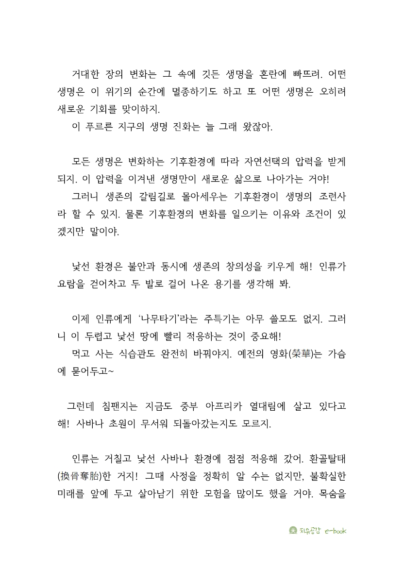이제 인류에게 ‘나무타기’라는 주특기는 아무 쓸모도 없지. 그러니 이 두렵고 낯선 땅에 빨리 적응하는 것이 중요해!