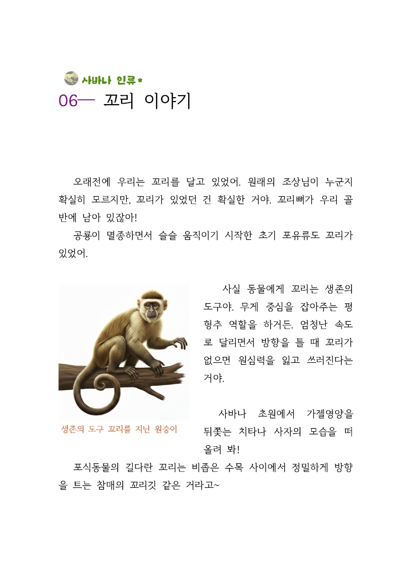 오래전에 우리는 꼬리를 달고 있었어. 원래의 조상님이 누군지 확실히 모르지만, 꼬리가 있었던 건 확실한 거야. 꼬리뼈가 우리 골반에 남아 있잖아!