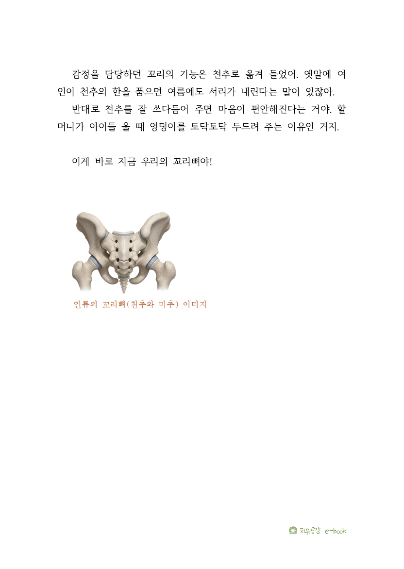 5개의 천추(Sacrum)가 하나로 합쳐져 단단한 지지대 역할을 하게 되었고, 꼬리는 몸 안으로 말려 들어가 미추(Coccyx)로 남게 된 거야.