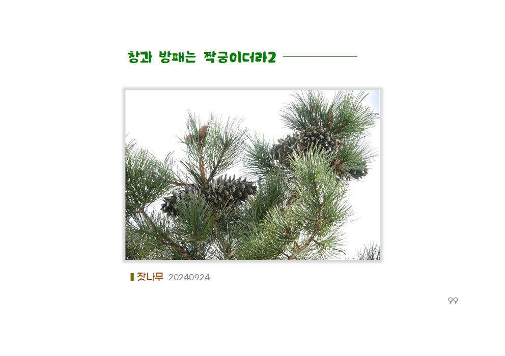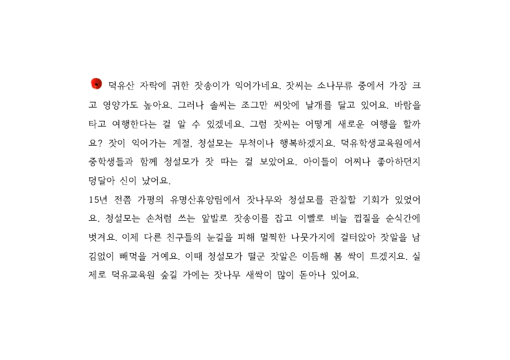 덕유산 자락에 귀한 잣송이가 익어가네요. 잣씨는 소나무류 중에서 가장 크고 영양가도 높아요. 그러나 솔씨는 조그만 씨앗에 날개를 달고 있어요. 바람을 타고 여행한다는 걸 알 수 있겠네요. 그럼 잣씨는 어떻게 새로운 여행을 할까요? 잣이 익어가는 계절, 청설모는 무척이나 행복하겠지요. 덕유학생교육원에서 중학생들과 함께 청설모가 잣 따는 걸 보았어요. 아이들이 어찌나 좋아하던지 덩달아 신이 났어요.