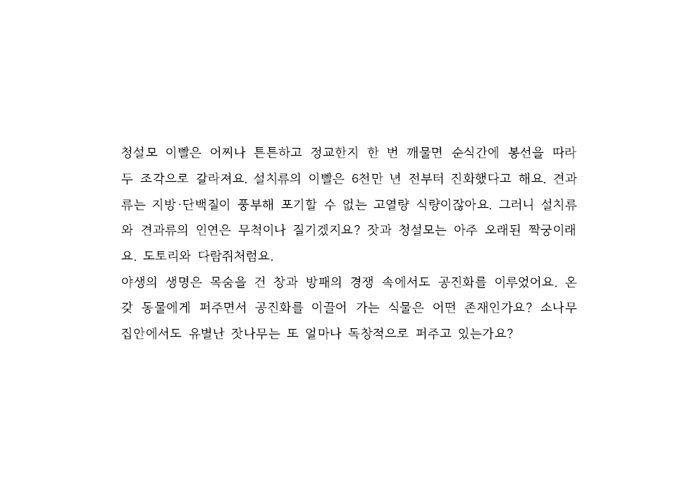 청설모 이빨은 어찌나 튼튼하고 정교한지 한 번 깨물면 순식간에 봉선을 따라 두 조각으로 갈라져요. 설치류의 이빨은 6천만 년 전부터 진화했다고 해요. 견과류는 지방·단백질이 풍부해 포기할 수 없는 고열량 식량이잖아요. 그러니 설치류와 견과류의 인연은 무척이나 질기겠지요? 잣과 청설모는 아주 오래된 짝궁이래요. 도토리와 다람쥐처럼요.