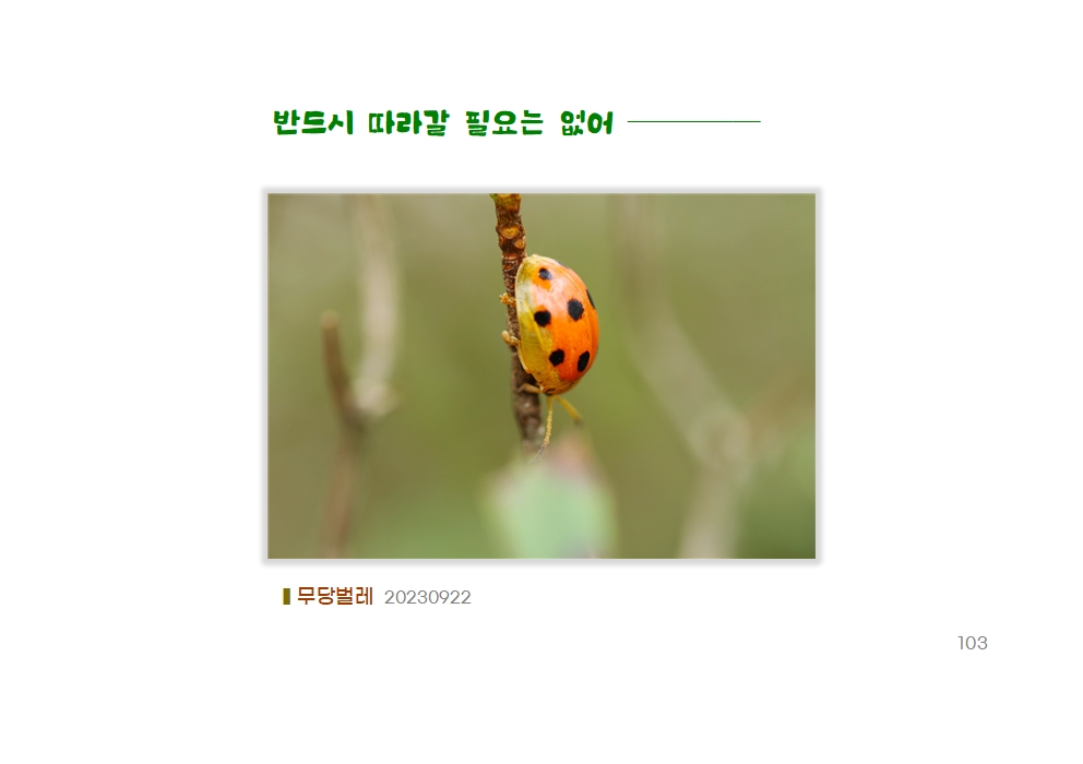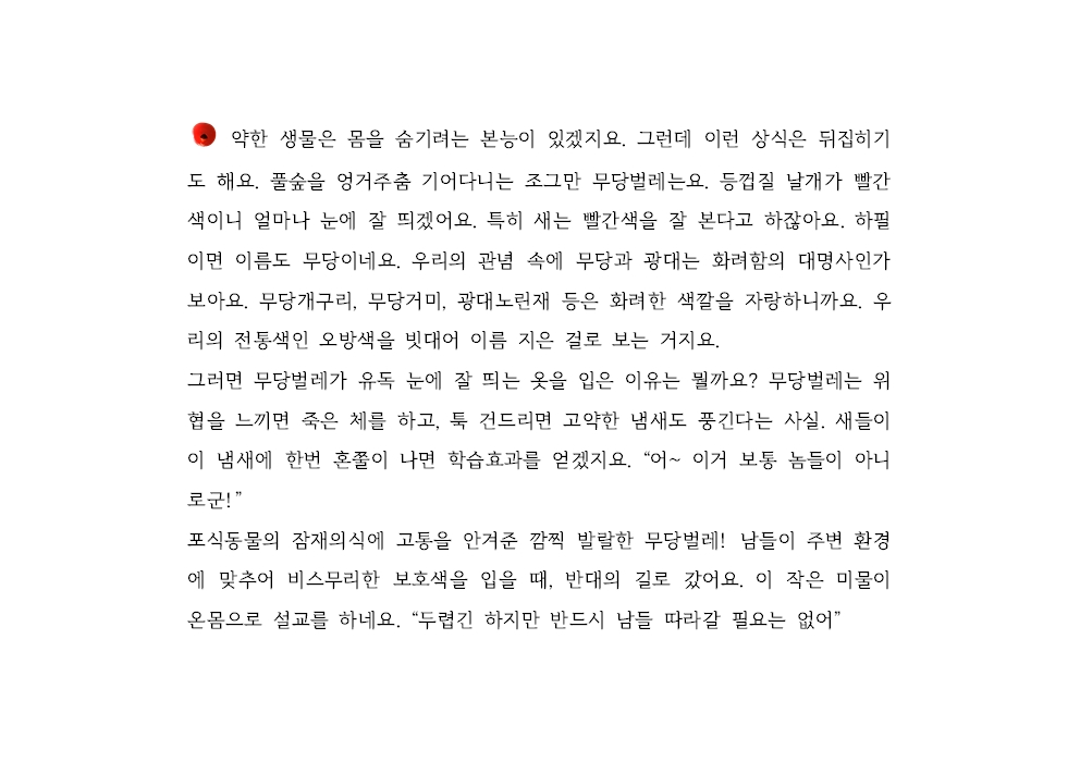 약한 생물은 몸을 숨기려는 본능이 있겠지요. 그런데 이런 상식은 뒤집히기도 해요. 풀숲을 엉거주춤 기어다니는 조그만 무당벌레는요. 등껍질 날개가 빨간색이니 얼마나 눈에 잘 띄겠어요. 특히 새는 빨간색을 잘 본다고 하잖아요. 하필이면 이름도 무당이네요. 우리의 관념 속에 무당과 광대는 화려함의 대명사인가 보아요. 무당개구리, 무당거미, 광대노린재 등은 화려한 색깔을 자랑하니까요. 우리의 전통색인 오방색을 빗대어 이름 지은 걸로 보는 거지요.