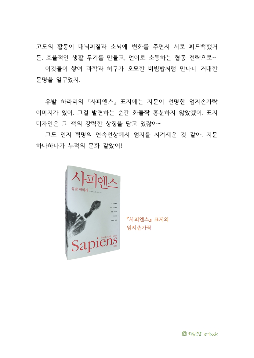 유발 하라리의 『사피엔스』 표지에는 지문이 선명한 엄지손가락 이미지가 있어. 그걸 발견하는 순간 화들짝 흥분하지 않았겠어. 표지 디자인은 그 책의 강력한 상징을 담고 있잖아~