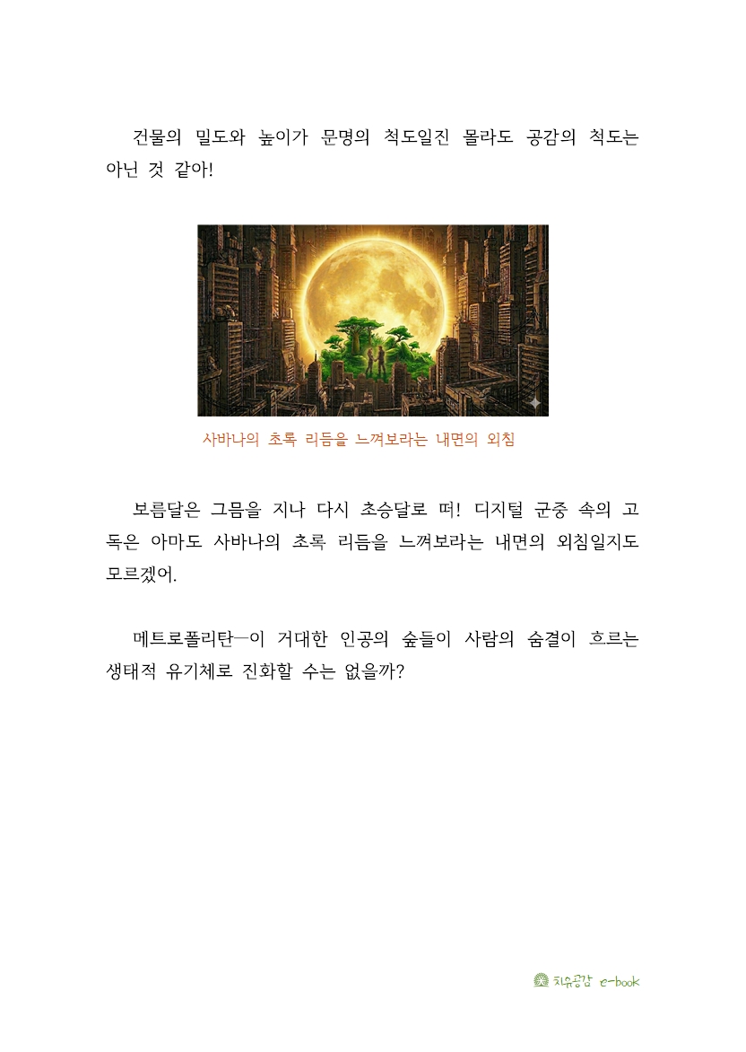 보름달은 그믐을 지나 다시 초승달로 떠! 디지털 군중 속의 고독은 아마도 사바나의 초록 리듬을 느껴보라는 내면의 외침일지도 모르겠어.