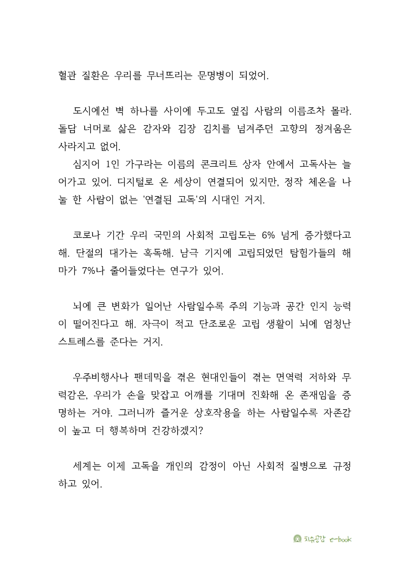 코로나 기간 우리 국민의 사회적 고립도는 6% 넘게 증가했다고 해. 단절의 대가는 혹독해. 남극 기지에 고립되었던 탐험가들의 해마가 7%나 줄어들었다는 연구가 있어.