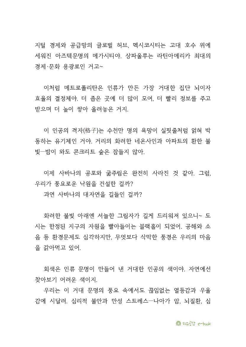 공해와 소음 등 환경문제도 심각하지만, 무엇보다 삭막한 풍경은 우리의 마음을 갉아먹고 있어.