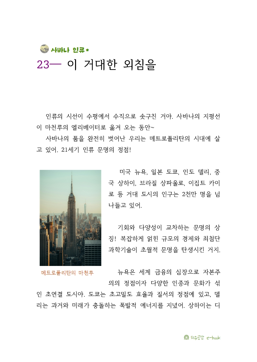 사바나의 품을 완전히 벗어난 우리는 메트로폴리탄의 시대에 살고 있어. 21세기 인류 문명의 정점!