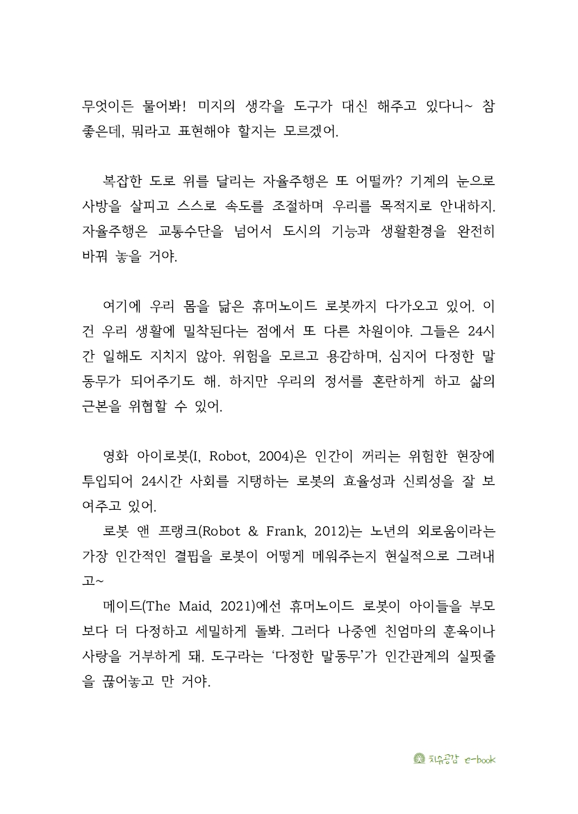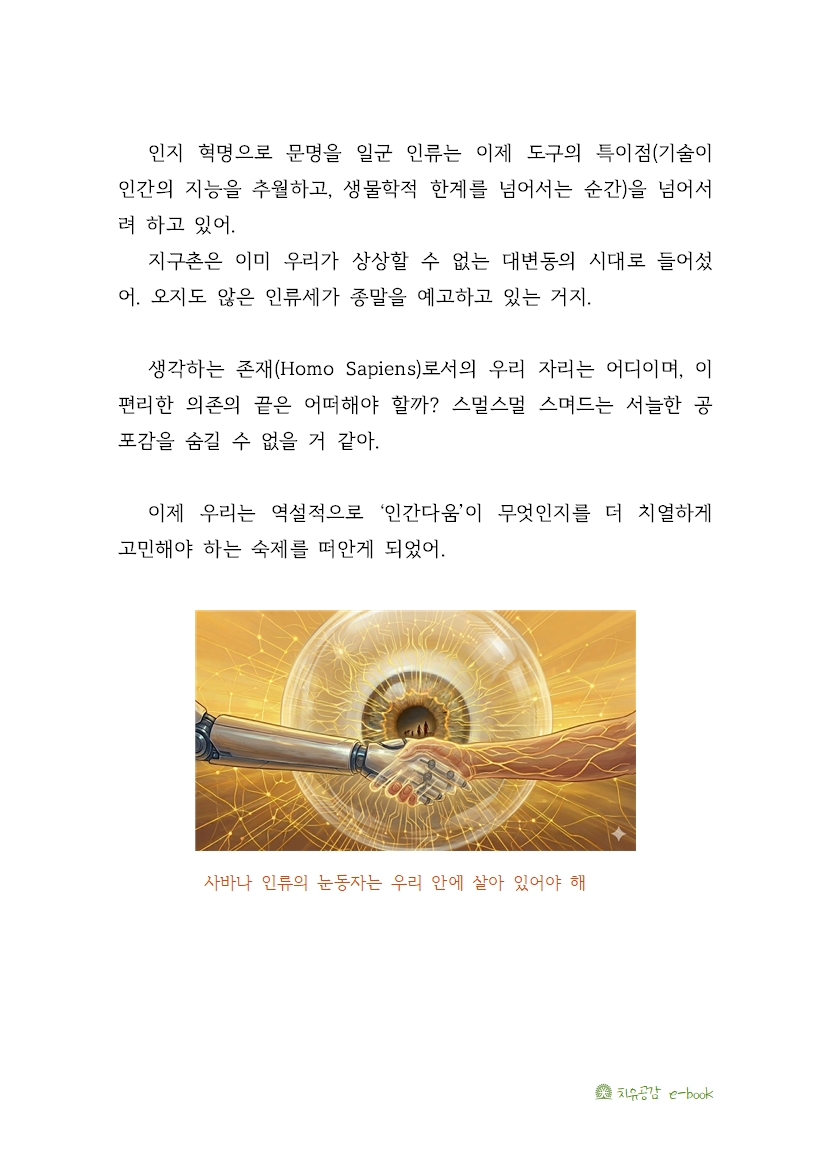 생각하는 존재(Homo Sapiens)로서의 우리 자리는 어디이며, 이 편리한 의존의 끝은 어떠해야 할까? 스멀스멀 스며드는 서늘한 공포감을 숨길 수 없을 거 같아.