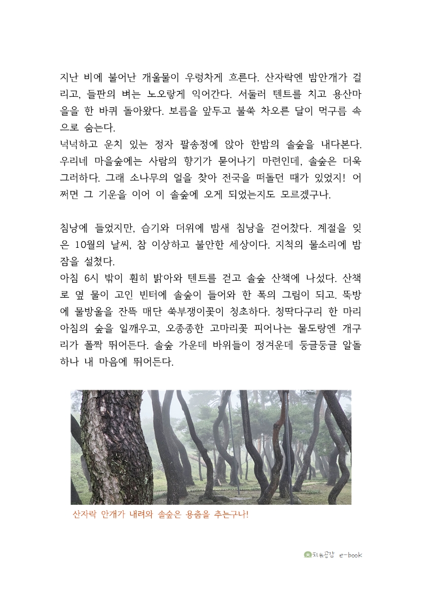 넉넉하고 운치 있는 정자 팔송정에 앉아 한밤의 솔숲을 내다본다. 우리네 마을숲에는 사람의 향기가 묻어나기 마련인데, 솔숲은 더욱 그러하다. 그래 소나무의 얼을 찾아 전국을 떠돌던 때가 있었지! 어쩌면 그 기운을 이어 이 솔숲에 오게 되었는지도 모르겠구나.