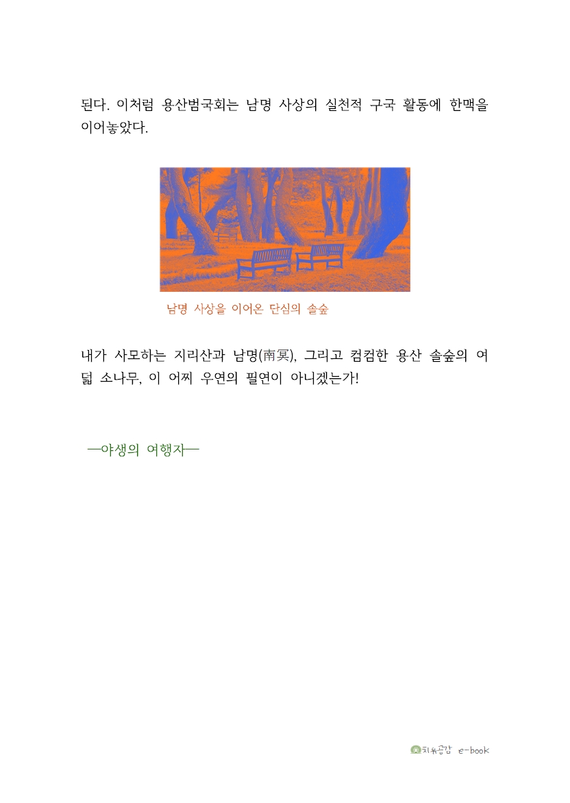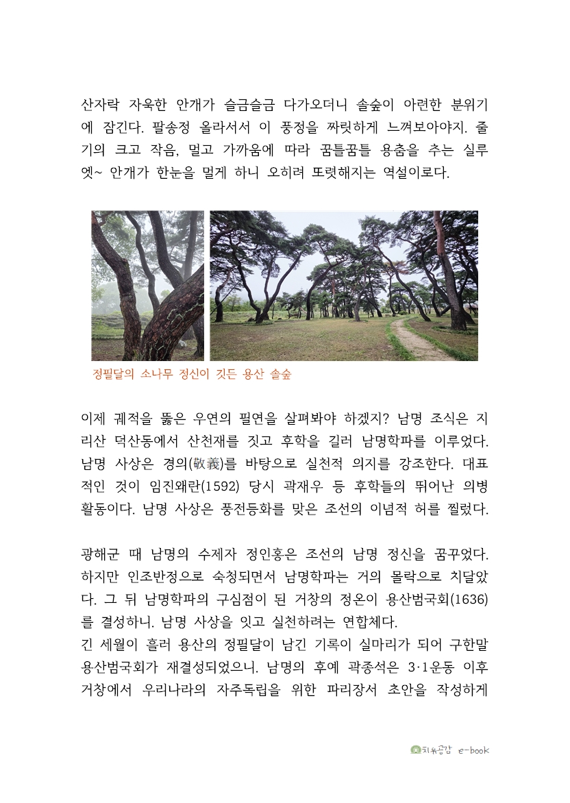 용산 솔숲은 지리산의 현자 남명 조식 선생과 연결고리(8)가 있었으니. 나는 남명 사상에 한 다리를 걸쳐두고 지리산 자락에서 십수 년을 살았다. 현실의 장벽을 정면으로 뚫고 나아가는 천 길 낭떠러지, 지리산 천석종의 무거움-남명 사상! 나의 궤적을 뚫고 지나온 우연은 필연이었더라.