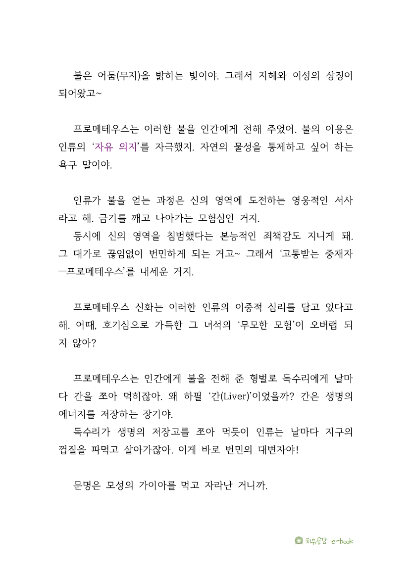 프로메테우스 신화는 이러한 인류의 이중적 심리를 담고 있다고 해. 어때, 호기심으로 가득한 그 녀석의 ‘무모한 모험’이 오버랩 되지 않아?