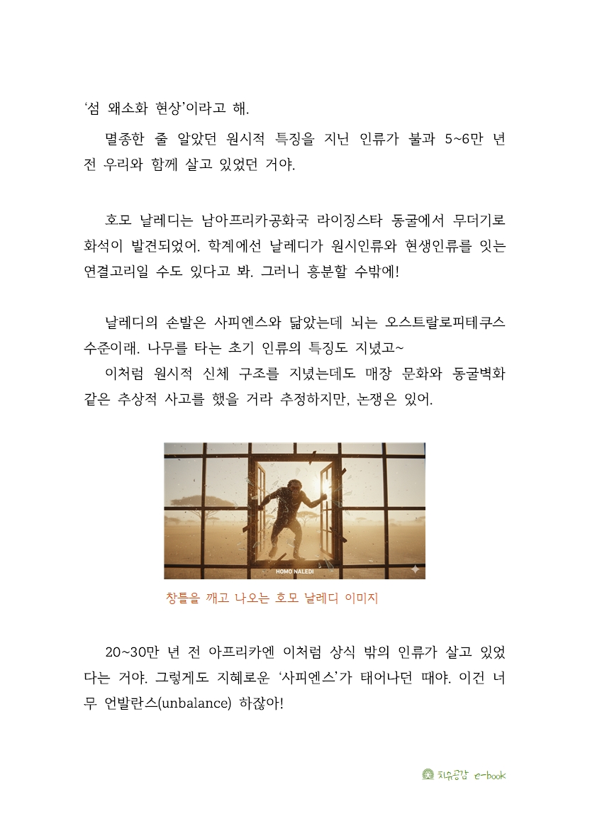 20~30만 년 전 아프리카엔 이처럼 상식 밖의 인류가 살고 있었다는 거야. 그렇게도 지혜로운 ‘사피엔스’가 태어나던 때야. 이건 너무 언발란스(unbalance) 하잖아!