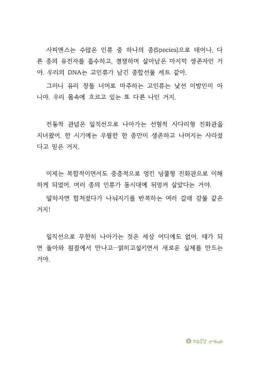 사피엔스는 수많은 인류 중 하나의 종(Species)으로 태어나, 다른 종의 유전자를 흡수하고, 경쟁하며 살아남은 마지막 생존자인 거야.