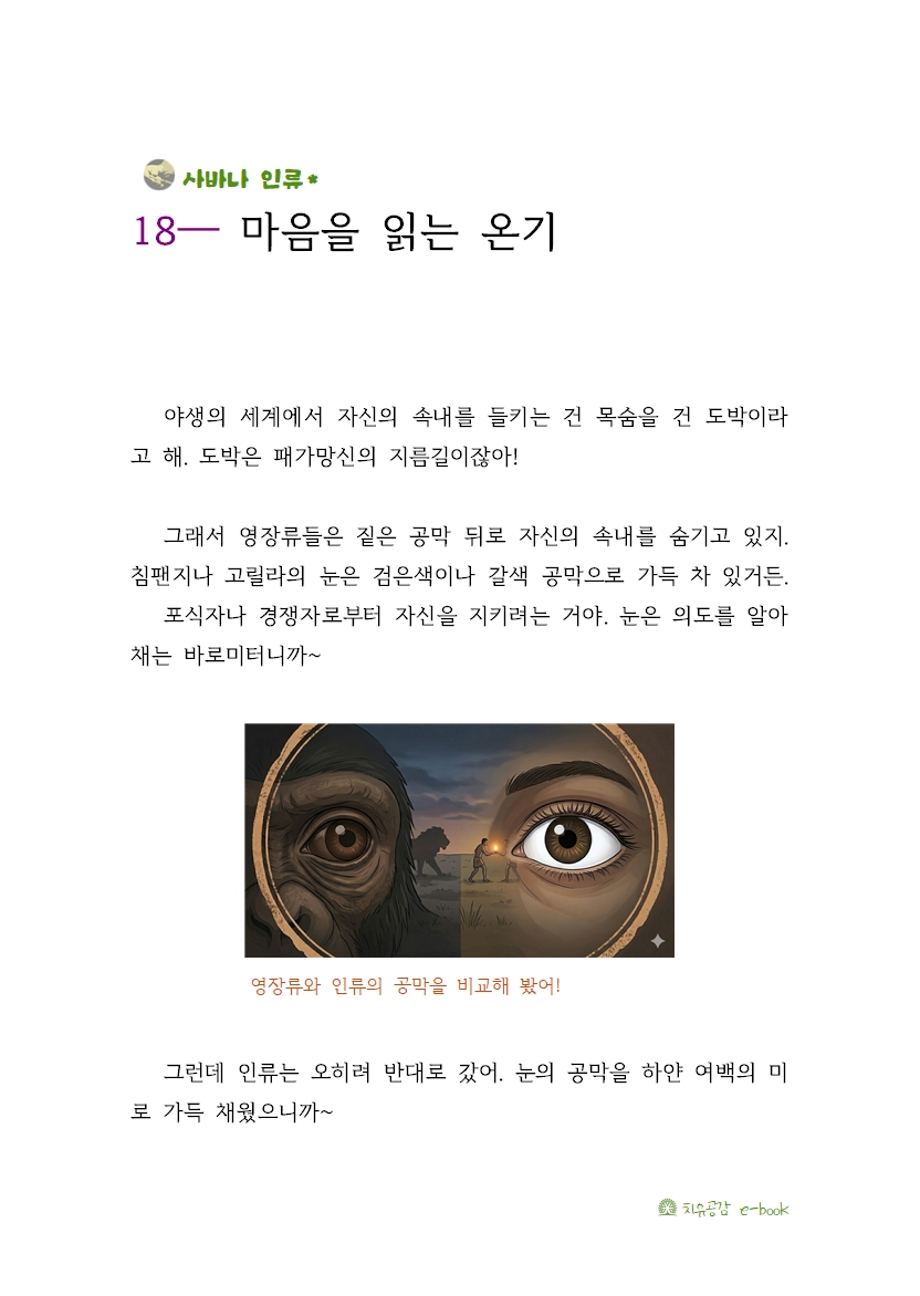 그래서 영장류들은 짙은 공막 뒤로 자신의 속내를 숨기고 있지. 침팬지나 고릴라의 눈은 검은색이나 갈색 공막으로 가득 차 있거든.
