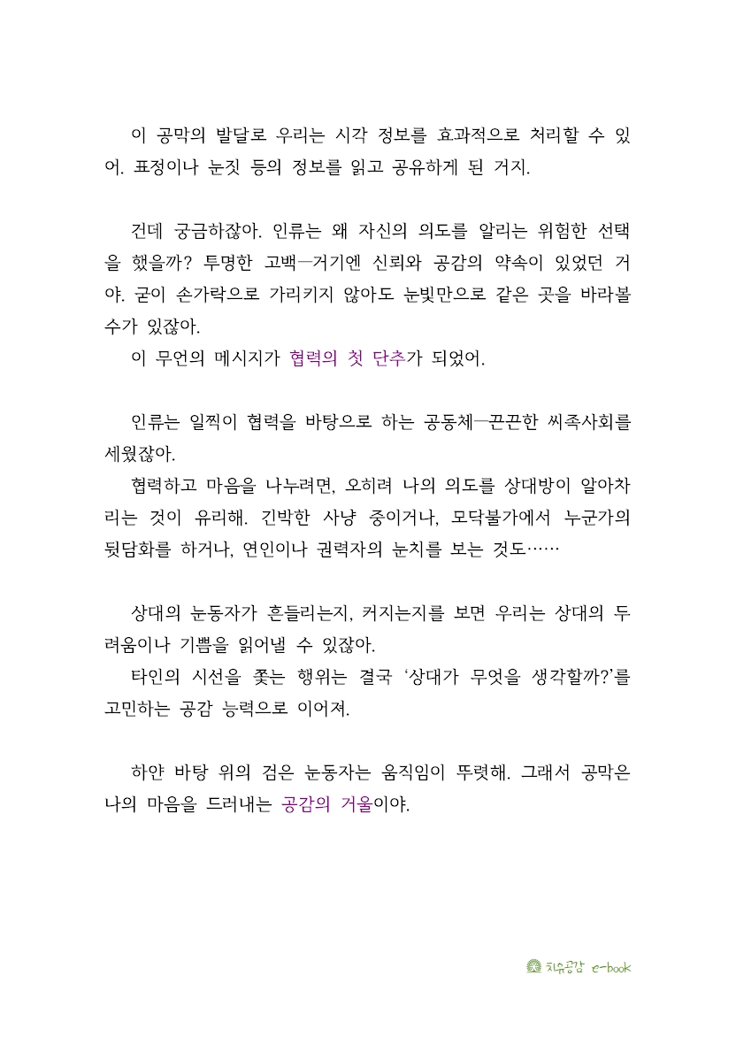 이 공막의 발달로 우리는 시각 정보를 효과적으로 처리할 수 있어. 표정이나 눈짓 등의 정보를 읽고 공유하게 된 거지.