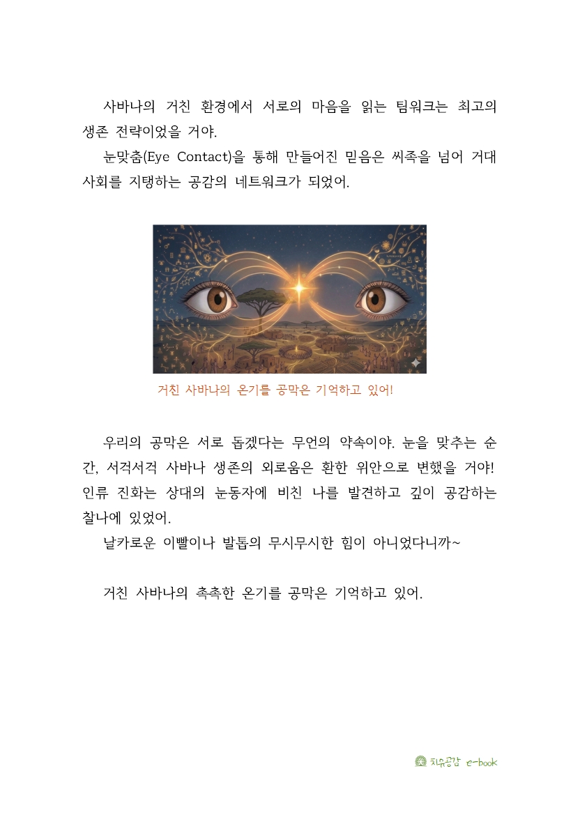 우리의 공막은 서로 돕겠다는 무언의 약속이야. 눈을 맞추는 순간, 서걱서걱 사바나 생존의 외로움은 환한 위안으로 변했을 거야!