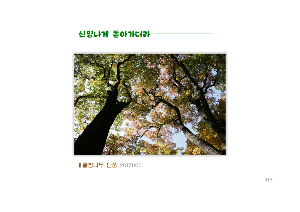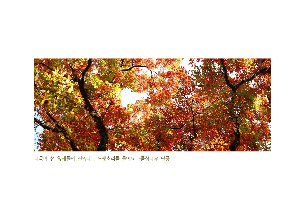 화려한 단풍철이네요. 그런데 참나무 단풍은 지나치게 화려하지 않고 쓸쓸하게 퇴색하지도 않아요. ‘수수한 여운’을 남긴다고 할까요. 함양상림 아름드리 졸참나무 아래, 하늘을 올려다보아요. 섬세한 가지에서 만엽의 바다가 출렁이고 있네요. 저마다의 몸을 떨어 부드러운 바람결에 손을 잡아요.