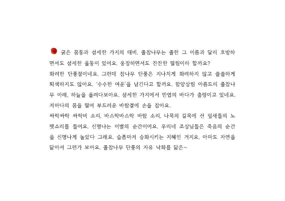 싸락싸락 싸락비 소리, 바스락바스락 바람 소리, 나목의 길목에 선 잎새들의 노랫소리를 들어요. 신명나는 이별의 순간이어요. 우리네 조상님들은 죽음의 순간을 신명나게 놀았다 그래요. 슬픔마저 승화시키는 지혜인 거지요. 아마도 자연을 닮아서 그런가 보아요. 졸참나무 단풍의 자유 낙화를 닮은~
