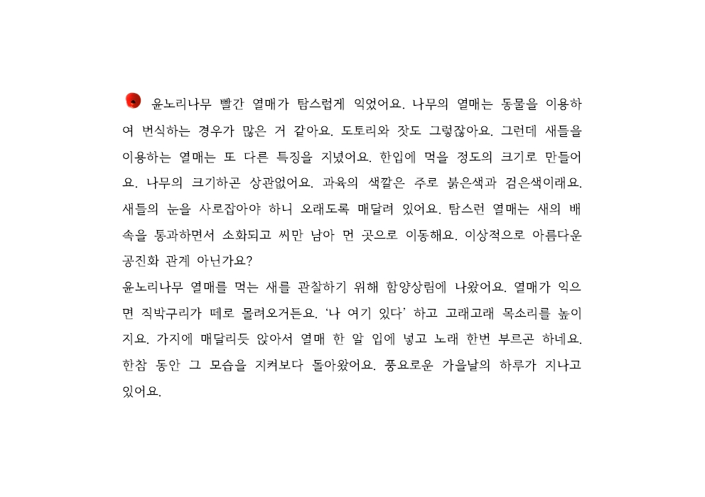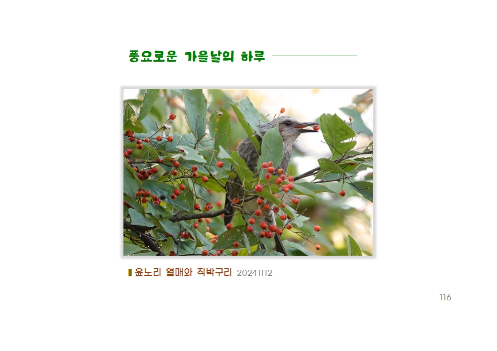 윤노리나무 열매를 먹는 새를 관찰하기 위해 함양상림에 나왔어요. 열매가 익으면 직박구리가 떼로 몰려오거든요. ‘나 여기 있다’ 하고 고래고래 목소리를 높이지요. 가지에 매달리듯 앉아서 열매 한 알 입에 넣고 노래 한번 부르곤 하네요. 한참 동안 그 모습을 지켜보다 돌아왔어요. 풍요로운 가을날의 하루가 지나고 있어요.