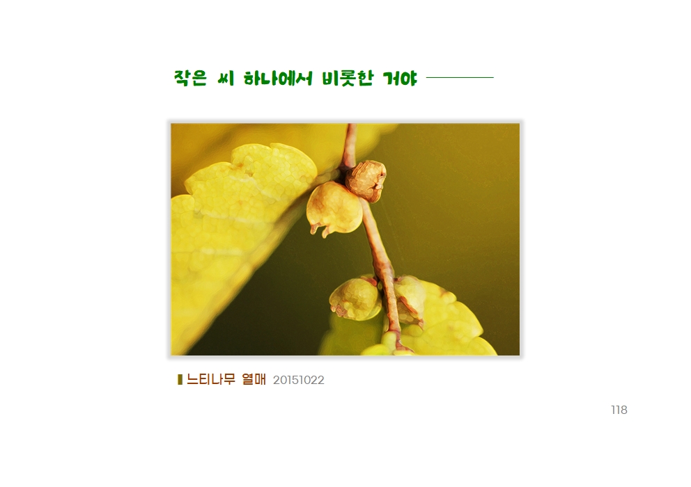 씨앗의 희망을 가만히 바라보아요. 이렇게 작은 씨 하나가 천년 세월, 정자나무가 된다니! 진화를 거듭하는 생명 작용이 얼마나 심오한가 싶어요.
