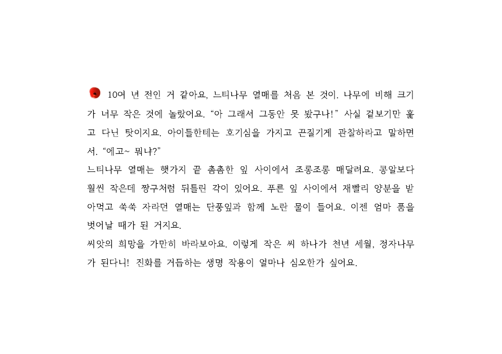 10여 년 전인 거 같아요, 느티나무 열매를 처음 본 것이. 나무에 비해 크기가 너무 작은 것에 놀랐어요. “아 그래서 그동안 못 봤구나!” 사실 겉보기만 훑고 다닌 탓이지요. 아이들한테는 호기심을 가지고 끈질기게 관찰하라고 말하면서. “에고~ 뭐냐?”