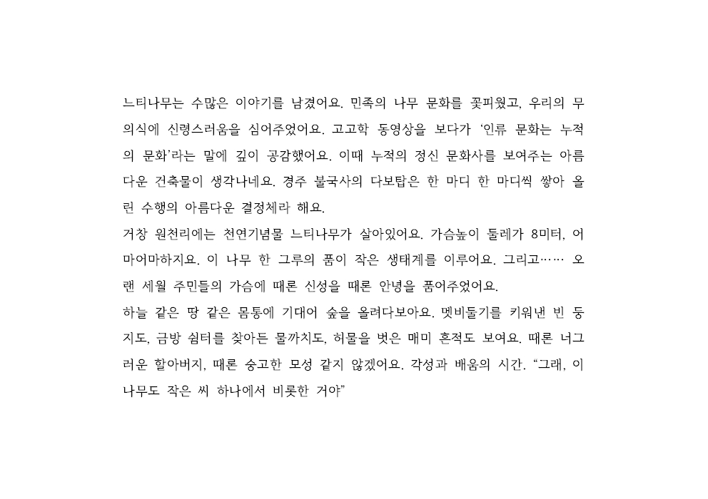 느티나무는 수많은 이야기를 남겼어요. 민족의 나무 문화를 꽃피웠고, 우리의 무의식에 신령스러움을 심어주었어요. 고고학 동영상을 보다가 ‘인류 문화는 누적의 문화’라는 말에 깊이 공감했어요. 이때 누적의 정신 문화사를 보여주는 아름다운 건축물이 생각나네요. 경주 불국사의 다보탑은 한 마디 한 마디씩 쌓아 올린 수행의 아름다운 결정체라 해요.