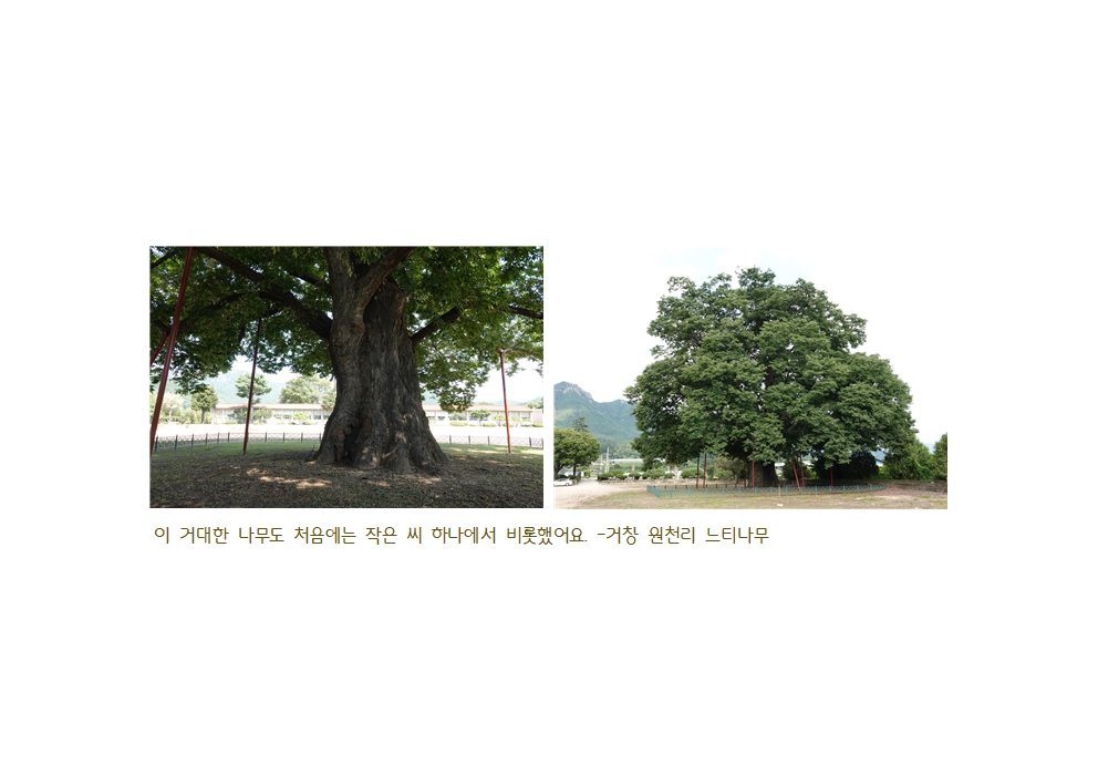 거창 원천리에는 천연기념물 느티나무가 살아있어요. 가슴높이 둘레가 8미터, 어마어마하지요. 이 나무 한 그루의 품이 작은 생태계를 이루어요. 그리고…… 오랜 세월 주민들의 가슴에 때론 신성을 때론 안녕을 품어주었어요.