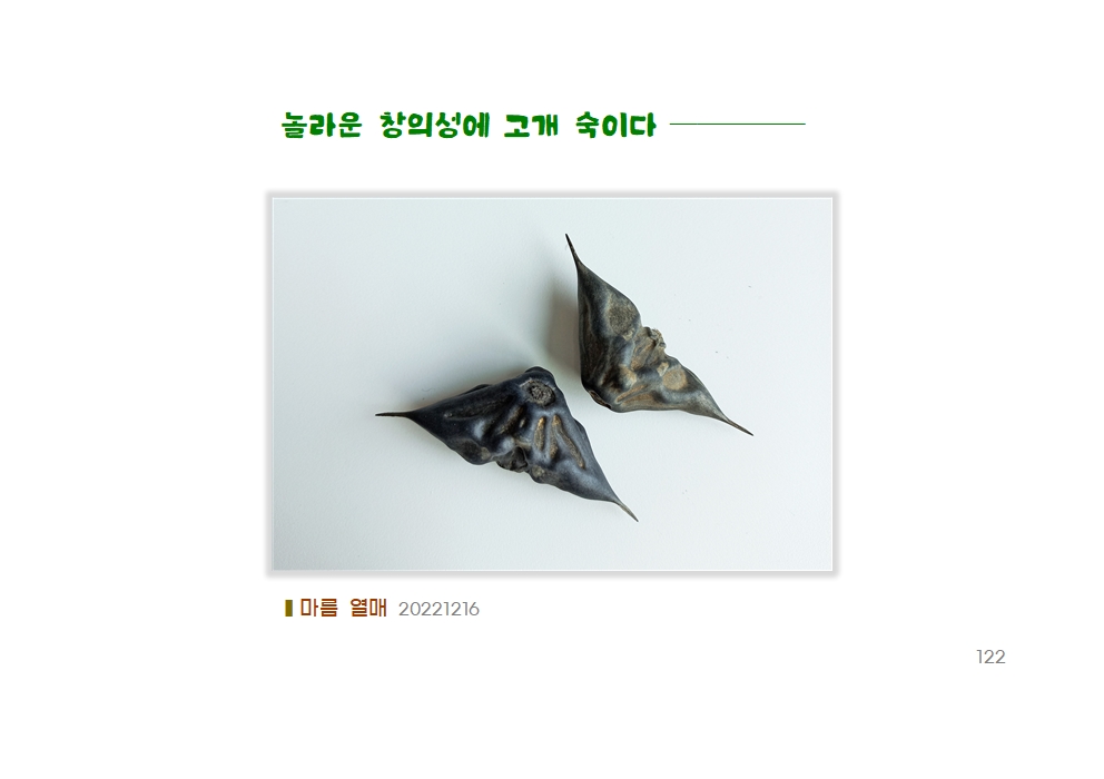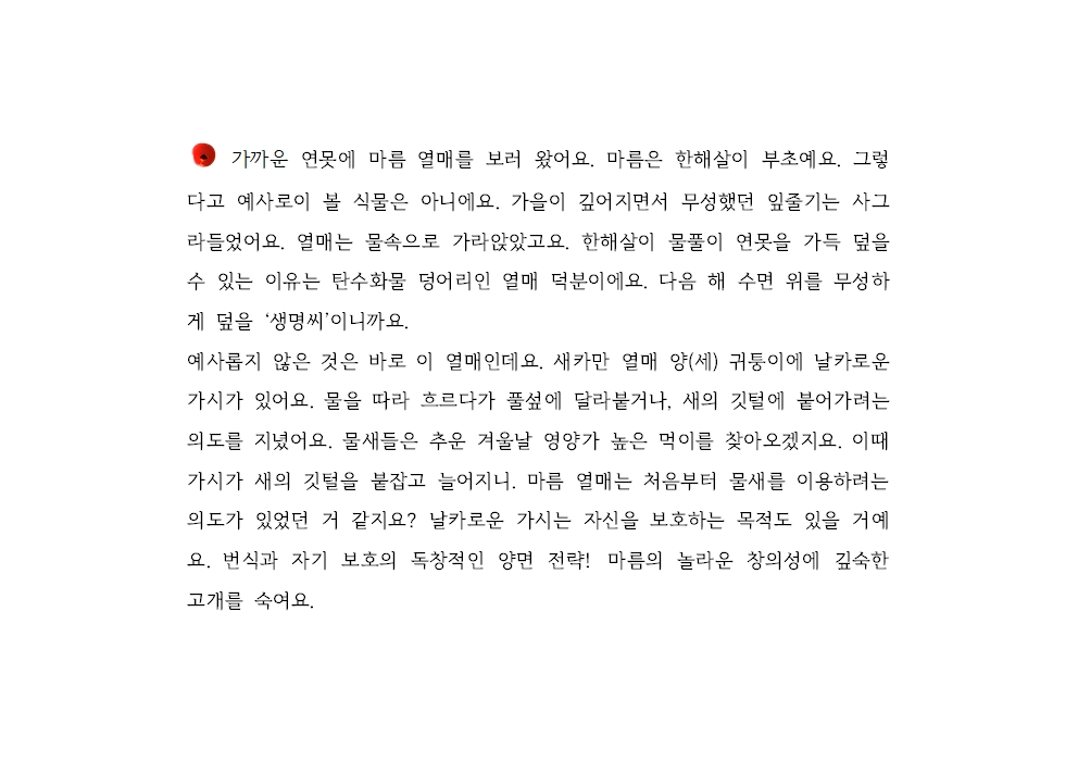 예사롭지 않은 것은 바로 이 열매인데요. 새카만 열매 양(세) 귀퉁이에 날카로운 가시가 있어요. 물을 따라 흐르다가 풀섶에 달라붙거나, 새의 깃털에 붙어가려는 의도를 지녔어요. 물새들은 추운 겨울날 영양가 높은 먹이를 찾아오겠지요. 이때 가시가 새의 깃털을 붙잡고 늘어지니. 마름 열매는 처음부터 물새를 이용하려는 의도가 있었던 거 같지요? 날카로운 가시는 자신을 보호하는 목적도 있을 거예요. 번식과 자기 보호의 독창적인 양면 전략! 마름의 놀라운 창의성에 깊숙한 고개를 숙여요.